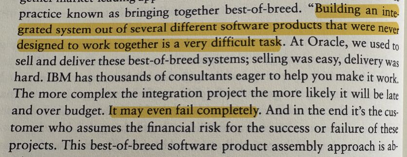As Ellison himself noted, the customer assumes the risk of this failure. Multi-year implementations. Budgets blown by orders of magnitude. Systems that work against the business rather than for it.